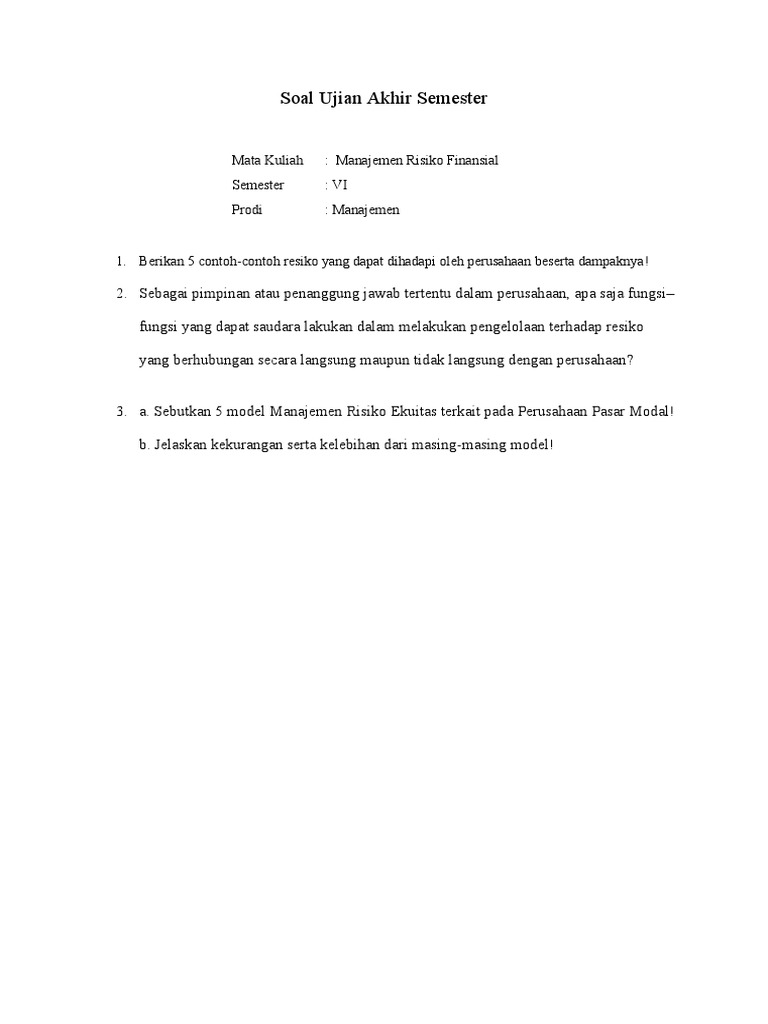 Mengidentifikasi keadaan khusus dan resiko luar biasa 3. Topik k3 lainnya yang bisa anda pelajari adalah contoh komunikasi vertikal,. Manajemen resiko dan asuransi soal dan jawaban 2018 di halaman ini anda akan mendapatkan contoh soal pilihan ganda tentang manajemen resiko dan asuransi lengkap jawaban yang bisa langsung dilihat dibawah ini. 3 contoh teks karya tulis ilmiah singkat dan sederhana (tentang perkembangan ekonomi indonesia manajemen syariah akuntansi, dan media sosial) materi kelas 5 sd semester 2 kurikulum 2013 revisi 2017 tema 6,7,8 dan 9; Baiklah kali ini penulis akan berbagi pengalaman, yaitu test sertifikasi managemen resiko level 1 yang diselenggagarakan oleh (lspp) lembaga sertifikasi profesi perbankan atau sering disebut ukmr (ujian kompetensi manajemen resiko), ok baiklah berikut sontoh latihan soalnya, semoga bermanfaat :